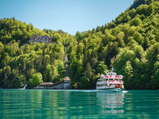Let the wind blow through your hair, feel the sun on your face and hear the lapping of the waves. A cruise on the turquoise waters of Lake Brienz will allow you to truly relax and let the passing beauty of nature work its magic. On the way, the captain repeatedly steers the boat towards the jetties of picturesque villages. If you’re hungry or thirsty, why not enjoy some refreshments in the on-board restaurant? The cruise takes you past beautiful landscapes, a mysterious island and the mighty thundering Giessbach waterfall. The deep turquoise colour of Lake Brienz is particularly impressive.