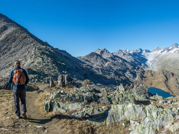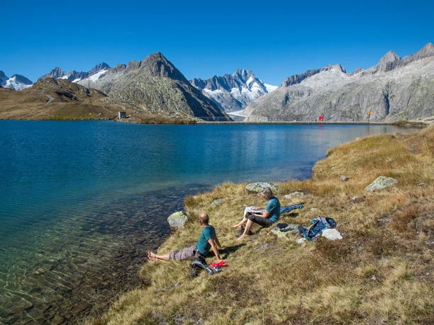 Refreshed, the path ascends gently to the Triebtenseelücke, which is simultaneously the Bern/Valais canton border. A last look back at the Bernese high Alps with the imposing Finsteraarhorn, and the panorama changes towards the southern Alps. The following descent to the Jostsee follows very beautiful paths. Only in the uppermost part caution is advised, as snow often persists here for a long time.