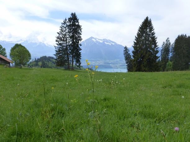 The route is mostly on the territory of the municipality of Heiligenschwendi. Here, the Bernese High Clinic for tuberculosis patients started operation in 1895. Today the clinic is a rehabilitation center. At the starting point of the route, pay attention to the Blueme signpost. Now follow a road past the clinic and a parking lot. At the Weide signpost location, turn left and ascend through a pasture. At Wolfgruebe, two routes are available; choose Blueme Teuffenthal, which initially runs along a forest road. At the junction about one kilometre later, turn right and ascend on a forest path. At the summit, there is a resting place to stop and a tower to enjoy the view. The route then continues downhill toward Tschingelallmi. After leaving the forest, the view of Lake Thun and the Alps opens, with the Niesen proudly on display. From the Tschingelallmi signpost, go straight along a pasture, through forest, and along a forest edge towards Gunten. Over the Margelsattel, reach Margel Pt. 1185 and at the next intersection turn right to Ringoldswil. Alternately flat, downhill, and uphill, the route leads over grassland, field paths, and finally a hard surface towards Ringoldswil. It is worth occasionally enjoying the changing scenery of Lake Thun and the Alps. At Chrinde Pt. 1033, turn right without significant elevation change on a hard-surfaced road. In the forest, turn left onto a footpath that descends to Schwändigrabe. Then ascend through the forest and along pastures to reach the end of the route.