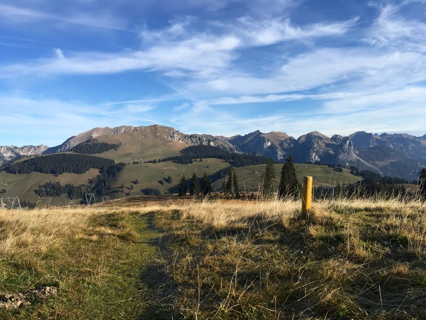 The hike takes place entirely in the Bernese area, as the cantonal boundary is not at the pass summit but just under 2 km further west. At the start of the hike at the Jaunpass Restaurant bus stop, the route to the intermediate destination Sparemoos applies. Marked as a hiking trail, this section is pleasant and safe to walk. You ascend to Oberenegg on an alp road. Some shortcuts across alpine pastures allow you to partially avoid sections on hard surfaces. Now a high-altitude hike follows. The view ranges from the Gantrisch range with the Stockhorn to the High Alps with the Wildstrubel and the Plaine Morte glacier. Further on, you hike on an alpine path, then on a trail over pastures and through forest. At Nüjeberg, you reach the Sparemoos moorland. It is of national significance and therefore specially protected. Three themed trails provide information about the moorland, wildlife, customs, and much more. At the Sparenmoos mountain hotel, follow the signpost Schauenegg, now marked as a mountain hiking trail. After a short stretch on the mountain road, turn right. On the right, the Schwarzesee lake appears. An alp road leads to the Hindere Schwarzesee alp. Then the descent takes place over alpine pastures to Schauenegg. Here the route turns left into the forest. Afterwards, the hiking goal Zweisimmen appears. You reach it passing Chäleweid and Hohliebi. The route, now marked as a hiking trail again, leads over pastures, paths, a short stretch on a forest road and finally through the village to the train station.