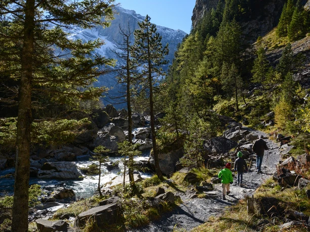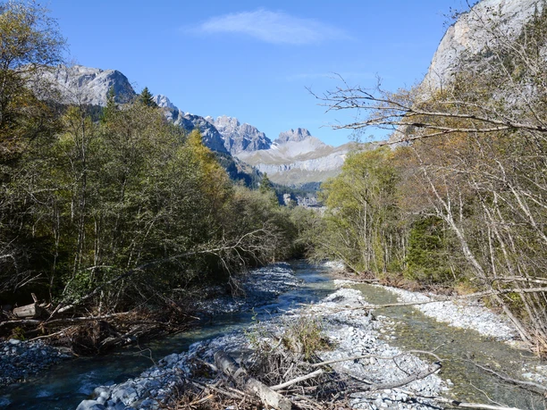From the Sunnbüel valley station near Eggeschwand, a sign points us to the narrow gorge on the left side, which marks the entrance to the Gasterntal. The first section through the narrow gorge (Chluse) is partly a bit steep and rocky. After the hiking trail crosses the Kander river a second time over a bridge, the valley slowly opens up in all its splendor: the Kander branches into several arms and the path running on the right side offers an increasingly impressive view of the massive mountain backdrop. Soon we cross the right side arm of the Kander and pass through a forested area to the beautifully situated Gasthaus Waldhaus – an ideal place for a first break.