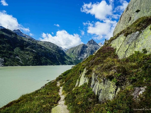 The trail along Lake Grimsel is marked as a mountain hiking trail, and the subsequent ascent to the SAC hut is marked as an alpine hiking trail. One should not underestimate the length and altitude differences of the hike as well as the partly exposed sections along Lake Grimsel.