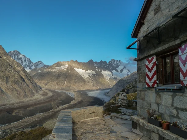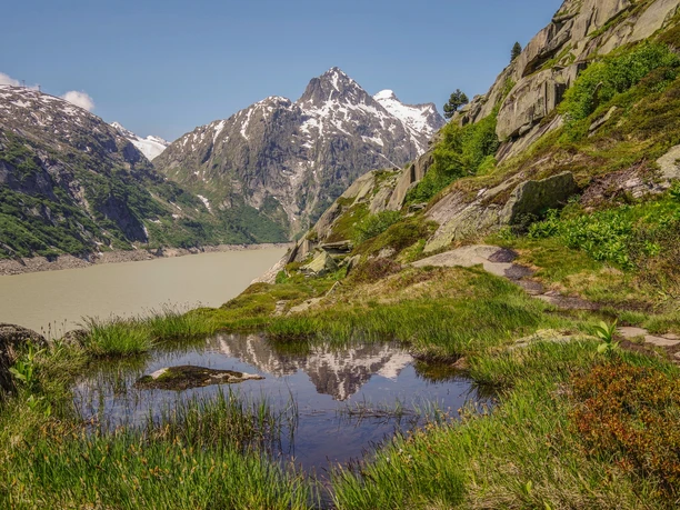 At the Grimsel Hospice, you first cross the dam and then enter a tunnel (flashlight). Afterwards, the mountain path leads along Lake Grimsel for kilometers. The view into the remote and rugged mountain world is impressive. At the end of the reservoir, you reach the former glacier forefield where a first flora gradually spreads. The glacier itself is no longer entered. On the recently created hiking trail, you reach the SAC hut and thus a great panorama of the retreating Lauteraar and Finsteraar glaciers.