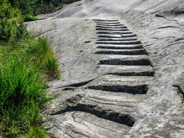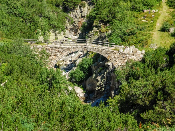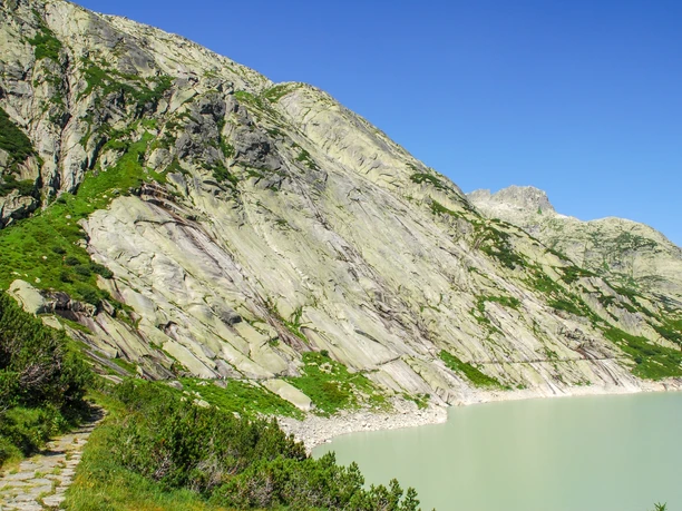 The path leads on the left, western side of the Aare around some ridge backs. Soon the Aare becomes the Räterichsbodensee, at whose rocky shores the path was partially adventurously carved into the rock. The path is safely laid out but being free from vertigo is certainly an advantage. Two romantic bridges further down cross the Aare back and forth. Shortly afterwards, the path follows along granite slabs that look like petrified waves of a sea, and soon after, Handegg is reached.
