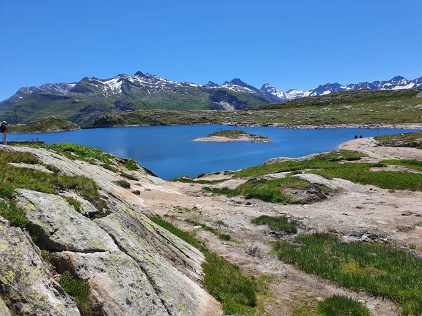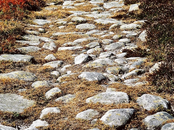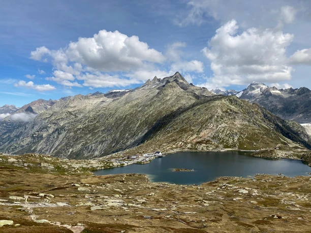 About 1000 steps separate Münster from the southern side of the valley with the young Rhone and the Rottenweg, which connects Ernen with Oberwald. 100 to 200 meters higher, the narrow forest trail stretches along the slope. On the soft ground, it feels like walking on a carpet. The clearings provide a view of the Minstigertal opposite and the villages of Münster, Geschinen, and Ulrichen, whose dark houses cluster around the white churches. West of the Ulrichen airfield, a lake stands out, created by partial removal of the runway. The excavation material was used after the 1999 avalanche winter to build the protective dam near Geschinen. In the hamlet Zum Loch, where the Ägene and Nufenen road cross, forest, Rotten and mule tracks converge and lead through a holiday settlement to Obergesteln. This place stands out with its Mediterranean architectural style strongly differing from the usual Goms village appearance. The village was rebuilt in a checkerboard stone construction style after the great fire of 1868. The old Grimsel path rises gently from the eastern edge along a small field road to the avalanche barrier at Milibach, crosses the protective dam, and after several zigzags meets the Goms high trail (point 1541). Here grazes peacefully a herd of calves and cattle whose bell ringing spreads a solemn atmosphere, supported by the church bells in the valley that now lies open and stands out favorably from the neighboring Alpine valleys due to its wide openness, loveliness, and rich greenery. The further ascent draws two loops in the even slope, which is crossed several times by an alpine road. Avalanches have stripped old trees, and now small birches and larches try to reclaim the lost ground. After Altstafel, the forest thins and the magnificent panorama with the Muttehörner, Piz Rotondo, Mittag- and Blinnenhorn becomes visible. The "paved" path sections, which have lasted for centuries, evoke admiration. Sometimes larger and sometimes smaller, flat stones are laid or set in a row to make a paving (Bikki). Chrizegge (2205 m) is the highest point of the route and the transition to the high plateau with glacially rounded rock knobs from the Ice Age. The Grimsel (2164 m) is much wilder than the Furka (2431 m) and despite the relatively low altitude gives a high alpine impression. The Totensee supposedly got its name from the dead thrown into the water after the 1799 battle between Austrians and French. However, the name is mentioned already in 1760 and perhaps refers to a lake without visible inflow or outflow.