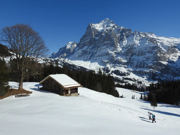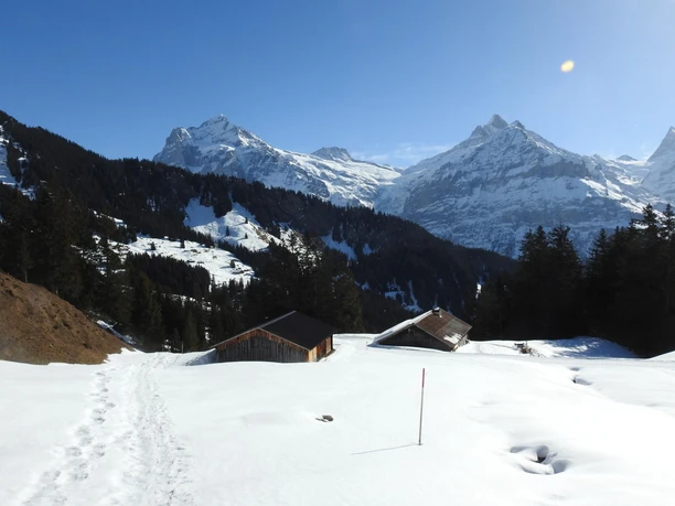 Scenic snowshoe route on the sunny slope above Grindelwald. From the bus parking lot in the center of Grindelwald, take the Grindelwald bus to Bussalp.