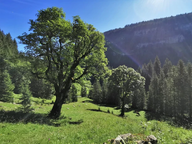 The Alp Botchen is a small, quiet paradise. In 2014 it was awarded the cultural landscape prize of the Oberland-East region. Mighty sycamore maples stand loosely scattered on the alpine meadows, with the Giessbach babbling between them. The area feels like a park – yet lies in the midst of pristine mountain landscape.