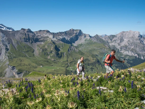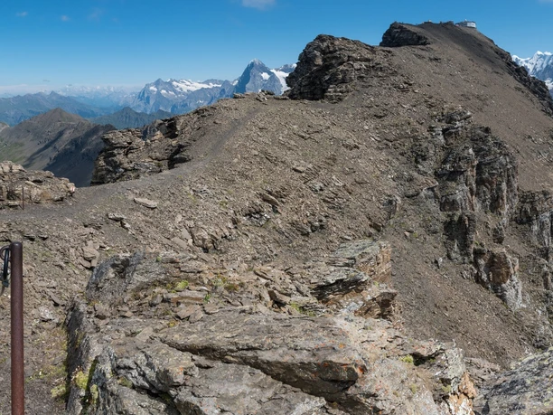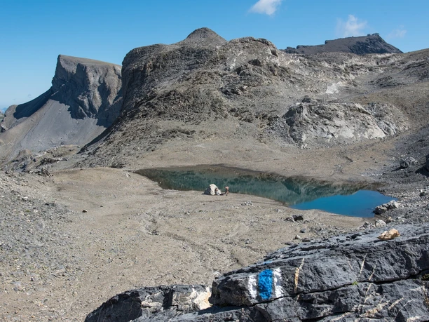 About 15 minutes and 100 meters altitude remain on the path towards Sefinafurgga. On a partially inconspicuous path, you ascend through steep grassy terrain to the Telli, with the view of the Blüemlisalp becoming ever more beautiful. The path remains steep until you see the Telli Pass. The terrain flattens, a nice place for a rest on the grassy area. The hiking trail changes character and the previously green ascent is replaced by a rocky landscape. At the Telli Pass at P. 2708, you get the impression of entering another world, resembling a Martian landscape. You continue straight on the faintly visible path towards the Schilthorn. Without significant elevation changes, soon the Tellisee is reached. Shortly before the Rote Härd junction, you meet the ridge and can enjoy the breathtaking view over the Sefine Valley towards the Bernese high Alps.