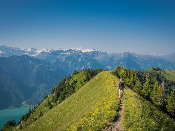 The path then leads southwest along the ridge to Suggiture and very steeply down to Tritt (to Niederried 2h30). Magnificent is the view down onto the Bödel, the alluvial plain between Lake Brienz and Lake Thun. The high trail over Horetegg (to Ringgenberg 2h15) and Ober Horet (to Harderkulm 1h15) offers magnificent close and distant views on both sides of the ridge. It then descends very steeply to the hut in Horet Läger, and the following 400 m descent to the valley floor takes less than 1 km of path. Over magnificent alpine meadows, it goes back from Tschieme via Schwendi and Bolsiten to Habkern.