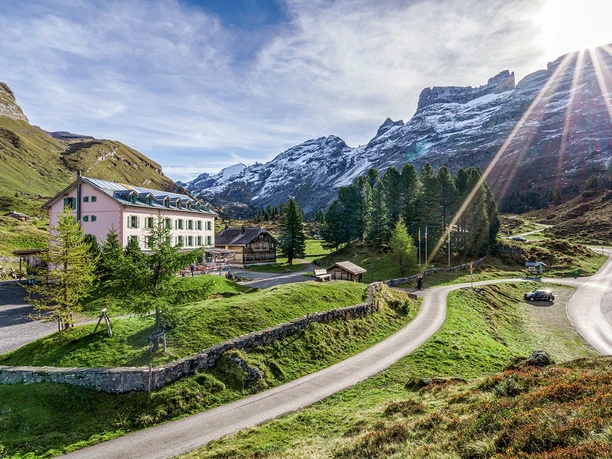 From Hotel Engstlenalp, the route first gently ascends on a forest road to Engstlensee. Magnificent is the view over the blue-green shimmering water to the Jochpass and the Titlis area. Downhill, several mountain ridges are then bypassed. From Scharmad, you enjoy the magnificent view through the wooded, quiet Gental to the peaks of the Upperland ice giants. The path runs almost horizontally above the tree line through the descending mountain slope to Bäregg. Gently ascending, it now goes through the open terrain below the Tällistock. The Sätteli, the transition to the Gadmertal, approaches. Noticeable to the right are the Sättelisteckleni, a rugged rock formation that, like the Gadmerfluh, resembles the Dolomites in South Tyrol. From the Sätteli, you enjoy a magnificent view: firn and ice, forest and meadows, from the climbing mountains of the Engelhörner to the Finsteraarhorn and over the glittering glaciers of the Trift, the Sustenhorn and the Titlis, everything lies open. The descent between rock bands is steep. The now following second part of the high-altitude hike passes the Tällihütte and the towering rock towers of the Gadmerflue along Alpligen to Raflue. Here begins the rapid descent to the mountain village of Gadmen, 400 meters below.