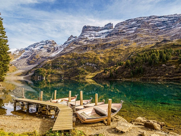The Engstlensee is a natural lake at the foot of the glacier-covered Titlis, surrounded by diverse flora and ancient larches standing amid the hilly moraine landscape. The area is under nature protection.