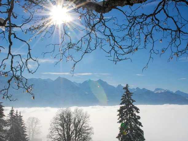 Arriving at Bodenalp at 1365 meters above sea level, the wire cable of the Niederhorn cableway crosses the winter hiking trail for the third and last time at a height. Passing the alpine hut Bodenalp, you now hike on the winter trail, which is also used as a cross-country skiing track, towards the Spirenwald. The path gently undulates and clings to the slope. Now and then, the view through the newly cleared forest can be enjoyed over the village of Beatenberg up to Eiger, Mönch, and Jungfrau.