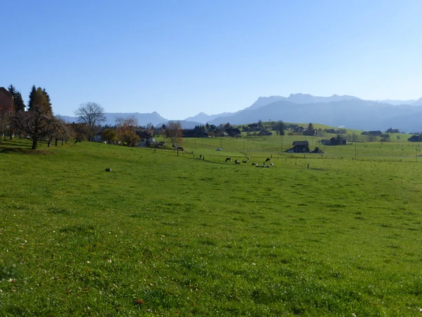 Von der Bushaltestelle Steffisburg/Post wenige Schritte ans Zulgufer. Bachaufwärts bis zum ersten Steg, wo man etwas vom Bach weg hält. Auf breitem Forstweg erst am Waldrand, dann durch schönen Mischwald dem gewundenen Lauf der Zulg folgen. Wohltuend ist die nur vom Rauschen des Wassers durchbrochene Stille. Auf dem schwankenden Waggelisteg geht es über den Bach und auf vorzüglich angelegtem Waldweg steil hinauf zur Schallenbergstrasse. Unterwegs prächtige Tief- und Ausblicke auf Steffisburg und auf die Stockhornkette. Auf Nebensträsschen und über Feldwege durchschreitet man nun die aussichtsreiche Hochebene über Fahrni, Fuchsegg, Hinderzünen nach Schwarzenegg. Eine überwältigende Sicht zum Talabschluss des Eriz mit Hohgant, Sigriswilgrat, zur Stockhornkette und zu den Schneegipfeln des hinteren Frutiglandes entschädigen für die insgesamt lange Strecke auf Asphalt. Von der Kirche Schwarzenegg behält man die Richtung noch 300 m bei, quert dann die Hauptstrasse und hält südwärts zum Gehöft Stäg. Von dort geht es grabenwärts steil zum Eselsteg hinunter und auf der anderen Hangseite ebenso steil durch den Wüleriwald wieder aufwärts. Nach dem Verlassen des Walds gelangt man in leichtem Anstieg durch den Weiler Burghalte und auf Landwirtschaftssträsschen weiter nach Buchen/Wägli und Lütschetal. Der Abstieg auf wenig befahrenen Strässchen an der Nordflanke der Egg über Enzebüel, Dreiligass, Gappe nach Steffisburg bietet unvergleichliche Ausblicke zum Churzeberg, zum Belpberg, ins Gurnigelgebiet, ja selbst zum Chasseral.
