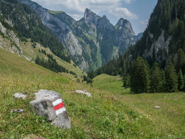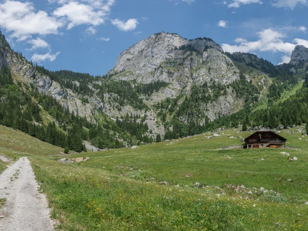Vom Jaunpass folgt man der Alpstrasse in Richtung Bäderhore bis zur Alp Grosse Bäder, wo man bereits angenehm einkehren kann. Je höher man dabei steigt, umso mehr kommen im Westen die markanten Felstürme der Gastlosen zur Geltung. Von der Alp geht es der Beschilderung Richtung Chlus folgend weiter. Zuerst auf einer Alpstrasse, dann auf einem Wanderweg durch den Wald, welcher kurz vor der Alp Buufeli wieder verlassen wird. Von der Alphütte folgt man einem Höhenweg mit schönen Aussichten ins Simmental, an der kleinen Schutzhütte am Wegesrand vorbei, bis zur Wegkreuzung Uf Pfad (P.1691). Hier halten wir uns rechts und steigen ab bis zur Alp Flue. Wieder folgt ein kurzer Abstieg durch den Wald bis zur nächsten Wegkreuzung bei der Alp Rieneschli. Wir zweigen nach rechts ab und steigen durch den Reidiggrabe Richtung Chlus ab, wobei stehts im Blick die Felstürme von Chemiflue und Trimlehore. Mit Erreichen des Talkessels bei Chlus stossen wir auf eine Fahrstrasse. Dieser Strasse folgt man gelegentlich auf kurzen Wanderwegabschnitten, zumeist aber auf der Strasse bis hinab nach Schwarzenmatt und schlussendlich weiter der Beschilderung folgend das letzte kurze Stück bis zum Bahnhof Boltigen.