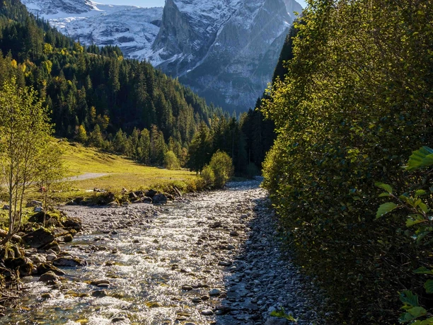 Vom Bahnhofplatz Meiringen startend geht es ostwärts der gelben Wegsignalisierung Richtung Rosenlaui nach. Auf dem Weg zur Aare läuft man Richtung Süden durch kleine Strassen mit vielen Ausblicken auf Felder, Wiesen und die prächtige Bergwelt. Am Wasser angekommen, folgt man dem Fluss wieder ostwärts. Nach Querung der Aare über die Brücke geht es auf der anderen Seite des Kreisverkehrs entlang der Hauptstrasse bis Willigen weiter. Dem Kulturweg Schattenhalb folgend, biegt man nach rechts auf den Scheideggweg ab, einen alten Saumpfad, der auf die Schwendi hinaufführt. Schon bevor man bald darauf die Aussichtsterrasse Zwirgi mit herrlichem Blick auf den Hasliberg erreicht, kann man auch den imposanten, 120 Meter hohen Reichenbachfall bestaunen. Nach einem kurzen Anstieg über Wiesen und durch Wald gelangt man auf den mit dem Post-Förderpreis 2025 ausgezeichneten Wanderwegabschnitt zwischen Brigglesyten und Kaltbrunnensäge, der nach der Verlegung nun dem Rychebach entlang auf Natur- statt Hartbelag verläuft. Weiter geht es über Gschwantenmad bis zum Nostalgiehotel Rosenlaui. Kurz vor Gschwantenmad weitet sich das Tal und gibt einen eindrücklichen Blick auf Wellhorn, Wetterhorn und den Rosenlauigletscher frei. Meist nahe der Fahrstrasse und dem Rychebach führt der Wanderweg zur Schwarzwaldalp, dem Endpunkt der Wanderung.