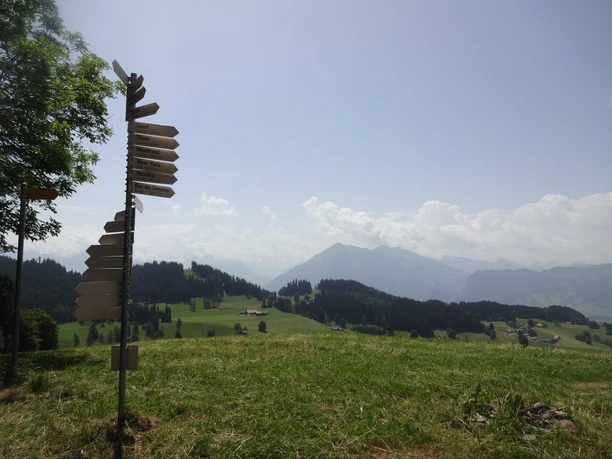 Am Ausgangsort der Wanderung bei der Bushaltestelle Goldiwil Kirche gilt die Angabe Hünibode. Auf einigen Wegweisern fehlt dieses Zwischenziel, dann ist die Route zur Multenegg einzuhalten. Auf Quartierstrassen steigt man zum Ortsteil Melli auf. Am Wegweiser am Standort Goldiwil/Flüeli 1020 m ist die Richtung Egg zu beachten. Nun zweigt ein Pfad links ab und steigt über Weiden oder durch Wald zur Egg auf. Neben dem offiziellen Wanderwegweiser geben hier 20 weitere die Entfernung zu Orten auf der ganzen Welt an. Jetzt ist dem Waldrand entlang zur Multenegg abzusteigen. Die Angabe Schwendi auf dem Wegweiser gibt die Richtung an. Ebenen Weges führt die Route zum Hünibode. Ein Rastplatz mit Feuerstelle kommt gelegen für eine Pause. Für die Fortsetzung der Wanderung ist die Angabe Gründerahorn einzuhalten. Dahin gelangt man über eine Weide und durch Wald. Der Baum wurde 1895 zur Erinnerung an den Bau der Höhenklinik gesetzt. Ein Denkmal erinnert an die Gründerpersönlichkeiten. Ein kurzer Abstieg führt zur Reha-Klinik. Auf dem Wegweiser steht die Bezeichnung des nächsten Zwischenziels: Niesenbänkli. Dieses erreicht man ohne grosse Höhenunterschiede auf einer Fahrstrasse und später auf einem Waldweg. Wie der Name verheisst, laden Sitzbänke zum Geniessen der Aussicht ein. Der Thunersee, der Niesen und weitere Gipfel der Berner Alpen sind hier zu sichtbar und warten darauf bestaunt zu werden. Erholt und beseelt von der eindrücklichen Landschaft steigt man über eine Weide nach Ringoldswil ab. Ab dann ist sollte man das Ziel Schwanden im Visier haben. Höhenwegmässig führt die Route zur Äschlenallmi und um den Margel herum zum Ziel bei der Bushaltestelle Schwanden Dorf.