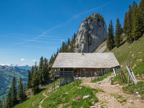 Es folgt ein kurzer Abstieg zur Alphütte Oberi Loohere. Anschliessend wird konsequent der Grat auf Pfadspuren verfolgt bis zum Gipfel des Wildestei (P.1936, auf der Landeskarte ohne Namen). Der Beschilderung Richtung Vorderstockealp folgend, steigen wir zuerst über den Ostgrat und weiter über Alpwiesen ab bis zu den Alphütten Vorderstocke. Ab der Wegkreuzung P.1784 folgen wir Richtung Chrindi dem ebenen Wanderweg bis zur Wegkreuzung P.1762 und nach einem weiteren kurzen Abstieg erreichen wir durch die kleinen Wegtunnel oberhalb des Hinderstockesee die Mittelstation Chrindi der Stockhornbahn.