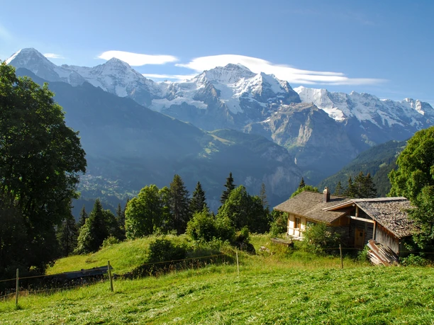 Die dicht aneinandergedrängten Häuser des Ortskerns von Isenfluh weisen zum Teil Fassadenbemalungen auf, wie sie im Frutigland heimisch sind. Oben im Dörfchen, beim ehemaligen Hotel Jungfrau (heute Genfer Bibelschule), ist die Sicht zur Jungfrau-Gruppe unvergleichlich schön. Nun zweigt man hangwärts vom Strässchen ab und steigt in vielen Zickzack-Kehren, ohne den Bach zu überschreiten, durch lockeren Waldbestand nach Sulwald hinauf (zur Gondelbahnstation 5 min). Wer einige Schritte aus dem Wald heraustritt, erlebt neuerlich einen herrlichen Ausblick in die Bergwelt des Lauterbrunnentals.