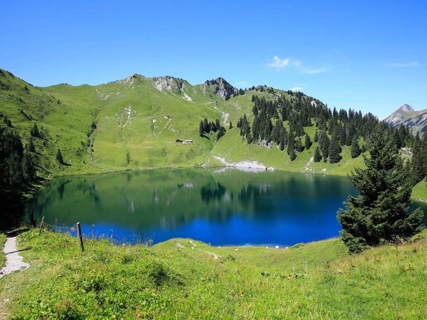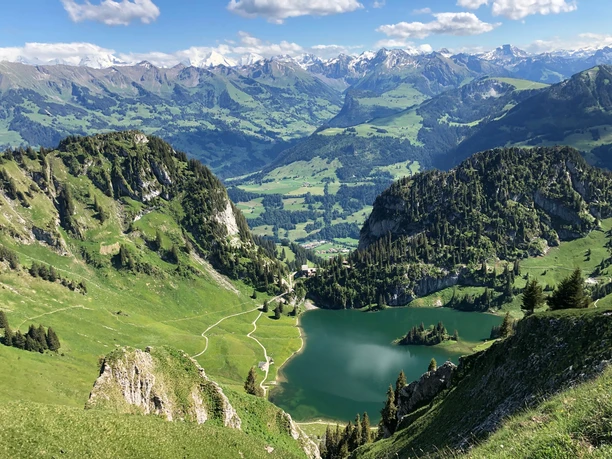 Wer mit der Seilbahn von Erlenbach auf das 2190 m hohe Stockhorn fährt, besucht einen Aussichtspunkt erster Güte: Der Blick vom markanten Gipfel reicht vom Jura über den Thunersee und die Voralpen bis zur Hochalpenkette. Doch auch wer nur den halben Weg auf sich nimmt und bis zur Mittelstation Chrindi fährt, taucht in eine andere Welt ein. Während unten im Simmental geschäftiges Treiben herrscht und der Strassenverkehr stetig fliesst, empfängt einen hier oben erholsame Stille und Beschaulichkeit. Zum Genuss trägt auch der Anblick des Hinterstockensees bei, der sich unterhalb der Mittelstation wundervoll grün schimmernd ausbreitet. Ein Rundweg führt rings um den See. Auf dem in die Mieschfluh gehauenen Felsenweg gelangt man zum Bergwanderweg, der nach Vorderstocke hinaufführt. Über saftig grüne Alpweiden, die locker mit mächtigen Tannen durchsetzt sind, geht es zum Oberstockensee hinunter. Auch um diesen ist ein Rundweg angelegt; auf ihm gelangt man, praktisch durchwegs dem Wasser entlang, zum Wald nördlich des Sees, den man nun im Aufstieg zur Alp Oberstocke streift. Dort verleitet die freundliche Gastlichkeit zu einer kürzeren oder längeren Einkehr. Die gleiche Familie verbringt hier seit acht Generationen die rund dreieinhalb Monate dauernde Alpzeit. Durch eine verkarstete, an seltenen Bergblumen reiche Waldmulde gelangt man nach Hinterstocke hinunter. Am Hinterstockensee gibt es Ruhebänke und einen grösseren Picknickplatz. Sowohl der Hinterstocken- als auch der Oberstockensee sind reich an Regenbogenforellen und deshalb bei Hobbyfischern ein beliebtes Ausflugsziel. Vom See steigt man zurück zur Mittelstation Chrindi der Stockhornbahn.