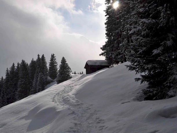 Lassen Sie sich vom Zauber der Natur verführen! Die Route beginnt bei der BLM-Station und führt Richtung Dorfzentrum. Vor dem Sportzentrum zweigt der Weg rechts ab und steigt durch das Quartier Ägerte und über den unteren Panoramaweg hinauf zum Gleis der Allmendhubelbahn (nicht überqueren!). Ein kurzer aber steiler Aufstieg führt auf den dick verschneiten oberen Panoramaweg. Leicht steigend folgt man der verschneiten Wegspur ins Gebiet Allmiboden. Nach vorsichtiger Überquerung der Skipiste steigt man dem Waldrand entlang zur Chänelegg hoch.