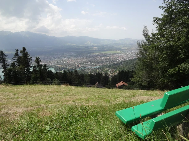 Über breiten Alprücken hinunter nach Ober Allmit (nach Allmit–Oberhofen 50 min, nach Allmit–Hilterfingen 1h) und in leichtem Auf un Ab über Halte zum Stierenegge (nach Hilterfingen 1h), einem erstrangigen Aussichtspunkt. Über üppige Matten und durch Wald gehts nun auf gut angelegtem Wanderweg steil hinunter nach Hünibach.