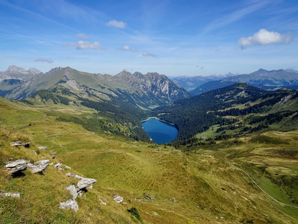Vom Gipfel gehts zunächst auf gleichem Weg zurück zum Col des Andérets, danach auf der östlichen Seite um die Palette herum zum Col de Voré. Der Abstieg von diesem Pass ist kurzzeitig recht steil und ruppig und verlangt Trittsicherheit. Beim Lac Retaud schliesst sich der Kreis, und das Restaurant ist offen, falls man nicht gerade einen Ruhetag erwischt. Bei bewirteter Rast lässt sich vor sich hinträumen, zurück zum Gipfel der Palette schauen oder gemütlich um den See schlendern. Man darf sich Zeit lassen, der Rückweg zum Col du Pillon ist in Kürze geschafft.