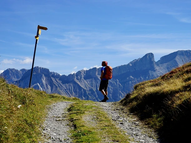 Gemächlich ansteigend führt der Wanderweg weiter in Richtung La Marnèche, dann über die Alp Isenau zum Col des Andérets und über den breiten Nordrücken der Palette auf den Gipfel. Eine prächtige Rundsicht belohnt den Aufstieg: über den Col du Pillon zu den vergletscherten Gipfeln der Diablerets, zum tiefblauen Arnensee oder über das Dorf Les Diablerets hinweg bis zu den Dents du Midi. Wer nicht schwindelfrei ist, sollte nicht zu nahe an die südliche Kante des Gipfels treten, denn die fällt nahezu senkrecht ab.