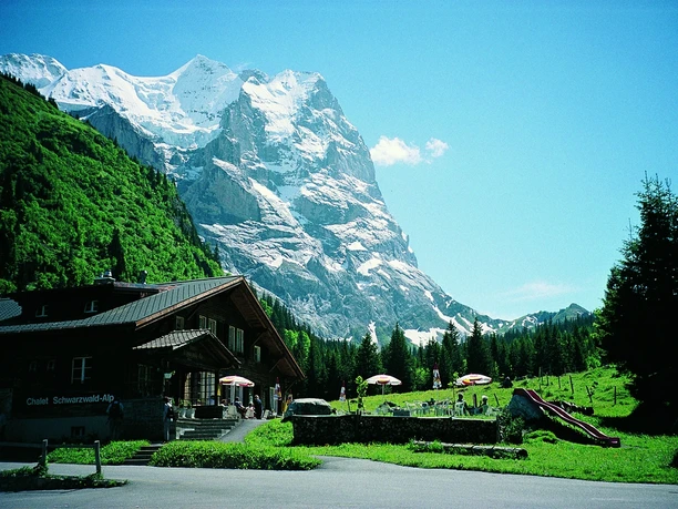 Kaum anderswo ist der Übergang aus bewaldeten Tälern über weite Alpweiden zu Fels, Eis und Schnee so bildhaft zu erleben. Jäh ragt die fast senkrecht abfallende Wand des Wetterhorns auf. Frei ist die Sicht über Grindelwald hinweg zur Kleinen Scheidegg, neben der sich die berühmt-berüchtigte Nordwand des Eigers erhebt. Für den Abstieg ins Gletscherdorf wählt man den alten, gut erhaltenen Saumweg, der die moderne Passstrasse mehrmals berührt. Im Undren Loichbiel schwenkt man hangwärts auf den Zugangsweg zum oberen Grindelwaldgletscher ein. Rund 600 m Abstieg sind von der Lamm bis zum dichtbesiedelten Talboden von Grindelwald noch zu bewältigen. Die Vogelschau ist perfekt. Leider aber ist von den das Dorf prägenden Gletschern nichts zu sehen. Beim grossen Gletschervorstoss um 1760 hatten sich die Eisströme so tief ins Tal gewälzt, dass deren Zungen bis in den Wald vordrangen. Die darauf folgende Berg-Euphorie führte schliesslich zur Erschliessung der Naturwunder durch Bergbahnen. Doch blieben nicht alle erfolgreich. Beim Hotel Wetterhorn steht noch eine Kabine des ehemaligen Wetterhorn-Aufzuges von 1908, der ersten Seilschwebebahn der Welt. Wegen Kapitalmangel und Beschädigung durch einen Felssturz wurde dem Unternehmen bereits 1934 ein frühes Ende gesetzt. Über Underhüseren erreicht man das lange Strassendorf Grindelwald.