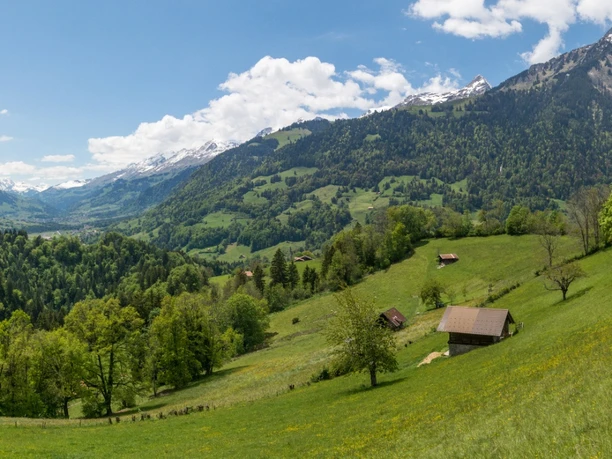 Vom Bahnhof Mülenen folgen wir ca. 400 m auf der Strasse der Beschilderung Richtung Aeschiried. Nun folgt der einzig nennenswerte Anstieg der gesamten Wanderung. Schnell flacht der Weg wieder ab und wir wandern auf einem breiten Grasrücken oberhalb des Suldgrabens leicht aufwärts. Ein kurzer Abschnitt am Waldrand führt entlang einer Weidewiese mit Alpakas. Nach etwas mehr als einer Stunde treffen wir in Aeschiried ein, wo wir der Beschilderung „Panoramaweg“ in Richtung Därligen folgen.