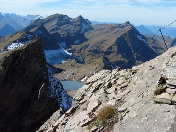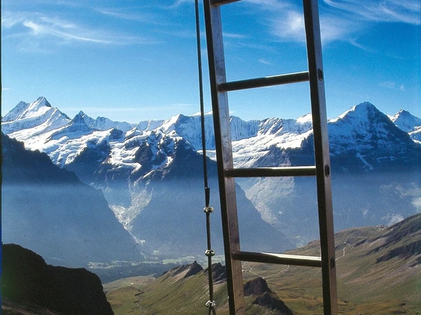 Wenn das Schwarzhorn ziemlich im Schatten des Faulhorns (2681 m) steht, trotz des grossen Panoramas, dann liegt es wohl daran, dass der Weg doch etwas anspruchsvoller ist und Gipfelstürmer sich oben nicht mit dem Ausruf «Frölein, es Bier!» auf die Terrasse setzen können. So bleibt das Schwarzhorn halt ein Ziel für Selbstversorger. Manche von ihnen haben seit gut zehn Jahren nicht nur Verpfl egung und Getränk im Rucksack, sondern auch ein Klettersteigset. Denn am Südwestgrat hängen seit 1995 Drahtseile und ein paar ziemlich luftige Leitern, die für einen leichten Adrenalinschub sorgen. Den gibt es seit dem Herbst 2015 auch auf dem «First Cliff Walk». Der Rundweg bei der Gondelbahnbergstation First besteht aus einem Steg in den Felsen des felsigen Gipfelkopfes, einer Hängebrücke und einem Aufstiegssteg mit Aussichtskanzel Richtung Hochgebirge von Grindelwald. Um den Klippenweg zu begehen, sind weder Klettersteigset noch Wanderschuhe nötig.