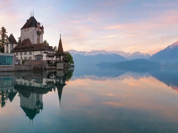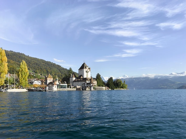 Wer das imposante Schloss Oberhofen nach der verspielten Architektur einzuordnen versucht, gerät arg in Nöte: Es handelt sich tatsächlich um eine mittelalterliche Anlage, die aber im 19. Jh. an romantisch verklärte Vorstellungen des Mittelalters angepasst wurde. Heute dient das 1954 eröffnete Schlossmuseum als Filiale des bernischen Historischen Museums und beherbergt eine umfangreiche Schau zur Wohnkultur im Kanton Bern. Im nahen Wichterheer-Gut sind ein Museum für Uhren und mechanische Musikinstrumente sowie die Kunstsammlung Im Obersteg untergebracht. Von der Schiffländte neben dem Schloss führt der Wanderweg zunächst hangaufwärts durch das Dorf, danach gegen Osten Richtung Klösterli. Nach der Überquerung des Riderbachs stösst man auf den sonnenexponierten Rebberg von Oberhofen. In dessen oberem Teil zieht sich der Weg weiter nach Längenschachen. Von dort folgt ein Pfad dem nahe beim See gelegenen Rand des Örtliwaldes. Beim Guntener Dorfteil Örtli mündet der nächste Graben, den man leicht ansteigend durchquert, worauf endgültig nach Gunten abgestiegen wird. Von Gunten geht es zunächst auf einem Teersträsschen hinauf in Richtung Hotel Bellevue, danach auf Naturbelag weiter, vorbei an Bauernhäusern und Obstgärten sowie durch Wald. Zwischendurch öffnen sich idyllische Ausblicke auf den See und den Niesen. Nach dem Abstieg nach Stampach, vorbei an Reben, führt ein sich zum Pfad verengendes Strässchen zur aussichts- und blumenreichen Bergwiese oberhalb des Schlösschens Ralligen. Durch das Ralligholz und an der Kirche vorbei gelangt man hinunter zur Bus- und Schiffstation Merligen.