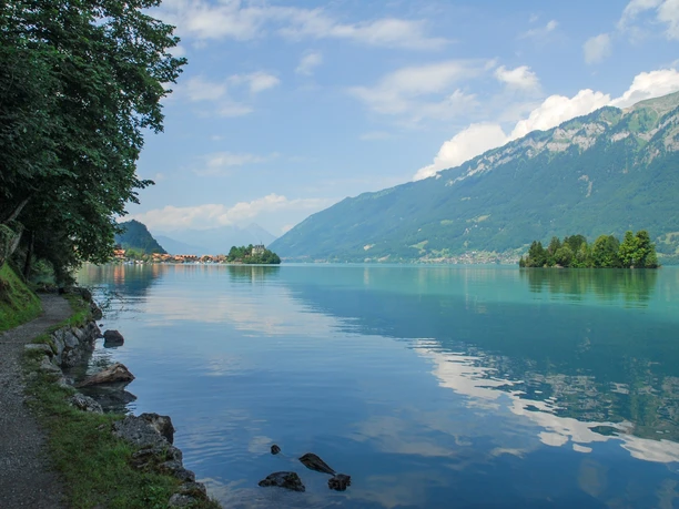 Es geht weiter am Ufer entlang, immer wieder mit schönen Blicken über den See. Bald entdeckt man die Schneckeninsel kurz vor Iseltwald, und wenige Minuten später steht man auf der Halbinsel und im Kern des einzigen Dorfes am linken Brienzerseeufer.