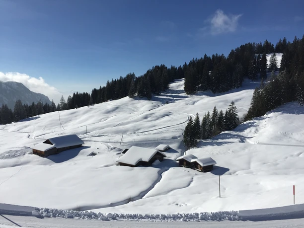 Der Winterwanderweg startet direkt beim Parkplatz Lägerstutz. Der präparierte Winterwanderweg führt dich ca. 1.5 km durch die einmalige Landschaft der Lombachalp und bietet einen wunderbaren Blick auf die umliegenden Berge und die verschneite Umgebung. Unterwegs kannst du dich auf der Sitzbank bei der Alphütte ausruhen und dich von der Sonne wärmen lassen. Am Schluss bildet der Weg eine kleine Schlaufe und führt auf dem gleichen Weg zurück zum Ausgangspunkt. Gönne dir nach dem Spaziergang eine Köstlichkeit im Restaurant Jägerstübli.