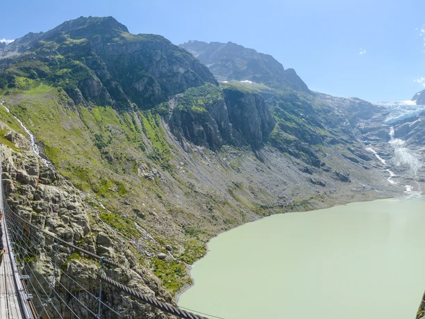 Vom Ende der Treppe bei der Bergstation der Trifftbahn geht es kurz zum Talboden und dann weiter über die Brücke. Auf der anderen Seite steigen wir bis zur Wegkreuzung Bosslis Stein auf. Hier halten wir uns links und gelangen so auf dem schön angelegten Höhenweg zur spektakulären Triftbrücke. Eine Überquerung der Brücke ist für schwindelfreie Wanderer obligatorisch und die schöne Aussicht lädt zu einer Picknickpause ein. Von der Brücke steigen wir auf dem ausgeschilderten Ketteliweg – wie der Name vermuten lässt über eine mit Ketten gesicherte Passage – bergauf. Weiter geht’s über einen flachen Abschnitt zurWindegghütte, wo man sich die feinen hausgemachten Kuchen nicht entgehen lassen sollte. Von der Hütte führt der Weg in Richtung der Erhebung, die mit einer Fahne (P.1875) gekennzeichnet ist. Vomda steilen Wanderweg hinab durch saftiges Grün gelangt man zur Wegkreuzung Bosslis Stein und auf oben beschriebenem Weg zurück zur Bergstation.