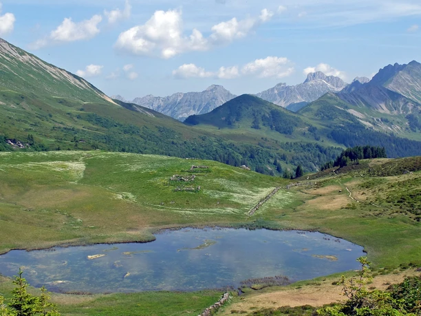 Ab Gstaad bringt uns das Postauto vorbei an Feutersoey und Gsteig durch die schöne Landschaft zum Ausgangspunkt Col du Pillon im Kanton Waadt. Die meisten Postautopassagiere eilen zur Seilbahnstation Glacier 3000. Wir beginnen mit der Wanderroute 46 «Tour des Alpes Vaudoises» Richtung Lac Retaud – Col de Voré – Arnesee – Feutersoey. Bald wird der Weg recht steil und nach einer guten halben Stunde erreicht man den kleinen, idyllisch in die Landschaft eingebetteten Lac Retaud. Nach einer kurzen Rast geht es weiter auf einem kurzen, recht flachen Wegstück. Anschliessend quert man ein altes Bergsturzgebiet und nimmt den letzten Anstieg zum höchsten Punkt der Wanderung (1918 m ü.M.), dem Col de Voré, in Angriff. Die Alpenflora ist wunderschön und auf der Passhöhe geniesst man einen grossartigen Rundblick zum Diablerets-Gebirge und dem Cape au Moine. Auf gutem Weg geht es nun leicht bergab an Moortümpeln und einem kleinen See vorbei, der von Enten und Blässhühnern bevölkert ist. Von Weitem sieht man den Stausee Arnesee mit dem Tschärzisbach als Zu- und Abfluss. Von der Alp Seeberg steigt man hinunter zum See und geht angenehm dem schönen Ufer entlang zur Staumauer. Eine Rast mit Blick auf den See wirkt entspannend. Ab der Staumauer geht man Richtung Hindere Walig – Tuxberg. Stellenweise läuft man über weichen, oft feuchten Moorboden. Hartbelag hat es nur auf dem letzten halben Kilometer nach Feutersoey. Voller Eindrücke von der interessanten Tour besteigen wir bei der Haltestelle Dorf das Postauto, das uns wieder zum Bahnhof Gstaad bringt. Je nach Umsteigezeit kann man noch den schönen, gepflegten Nobelort erkunden.