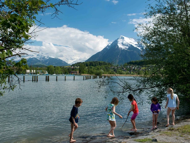 Sanft absteigend geht’s am etwas versteckten Strättligturm vorbei, wo einst die Edlen von Strättligen hausten. Jenseits der Simmentalstrasse steht man unvermittelt vor dem dunklen Schlund des Kanderdurchstichs. 1713 sollte die Kander damit zur Schuttablagerung im Thunersee gezwungen werden. Bereits ein Jahr später riss der wilde Fluss den gesprengten Stollen ein. Auf dem soliden Strättligsteg ans jenseitige Flussufer und hinauf nach Einigen. Ein Strässchen führt nun über einen aussichtsreichen Hügelrücken nach Riederen. Anschliessend wird der Rustwald auf Forstwegen und schmalen Pfaden durchschritten. Im Spiezmoos unterquert man Bahnlinie und Hauptstrasse und steigt zum bewaldeten Spiezberg hoch. Am Waldrand geniesst man nochmals einen herrlichen Ausblick über die Rebgärten zu Schloss und Schlosskirche von Spiez. Durch die Schlossanlage geht es auf einem Treppenweg hinunter zur Ländte in der Spiezbucht.