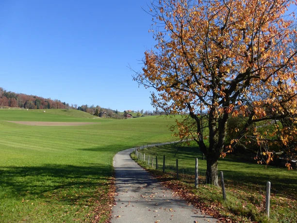Am Ausgangsort ist das Ziel Steffisburg auf dem Wegweiser vermerkt. Der Weg sollte sich also ohne Probleme finden lassen. Das Dorf Heimenschwand verlässt man in Richtung Westen. Bald ist links abzuzweigen. Der Blick fällt auf Voralpen und Alpen, so etwa auf die Schrattenflue, den Hohgant, Niesen oder das Stockhorn. Nun erfolgt ein erster Abstieg über Feldwege und Fahrstrassen am Ortsteil Birchbüel und bei den Gehöften Ey hinab zur Rotache. Gleich geht es wieder aufwärts, zuerst durch Wald, dann über einen Feldweg. Auf der Anhöhe ist rechts abzubiegen. Am Wegweiserstandort Lood vorbei gelangt man zum Gutshof Ufem Port. Der Wegweiser gebietet links abzubiegen, um nach Steffisburg zu gelangen. Ein kurzer Abstecher geradeaus in Richtung Lueg lohnt sich, denn wenig später erscheint links auf einer Anhöhe ein Signal der Landesvermessung. Es gehört zur Gedenkstätte, die Professor Eduard Imhof gewidmet ist. Die Gemeinde Fahrni würdigt damit ihren wohl berühmtesten Bürger. Der international anerkannte Kartograph hat unzählige Kartenwerke wie die Schweizer Schulkarte erschaffen. Ein Rastplatz lädt zum Verweilen und Geniessen der Aussicht ein. Das Panorama reicht von den Alpen über das Mittelland bis zum Jura. Nach diesem Abstecher schliesst sich der Abstieg nach Steffisburg an. Durch das Dorf Rachholtern gelangt man nach Birchi und weiter durch den Birchigraben und dem Schluuchbach entlang hinunter nach Steffisburg.