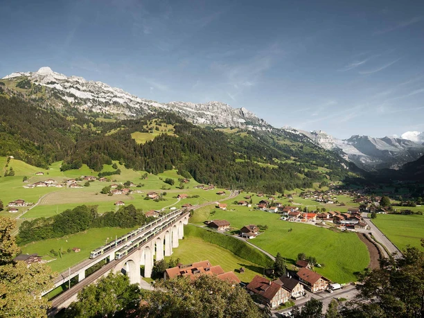 Le point de départ de ce circuit est Spiez. Là, vous montez tranquillement dans le RegioExpress et cherchez une place assise. Cette ligne ferroviaire est l’un des ouvrages les plus importants de l’histoire des chemins de fer suisses. Elle impressionne particulièrement par ses ouvrages tels que l’imposant viaduc de la Kander, les boucles hélicoïdales autour de Felsburg ou le pont exceptionnel du Bietschtal près de Rarogne. Le voyage en train, aussi captivant que convivial, est à lui seul une expérience particulière. Le point fort reste toutefois les paysages impressionnants que vous découvrez en cours de trajet. Une fois arrivé à Brigue, vous pourrez organiser votre séjour à votre guise et explorer le Valais.