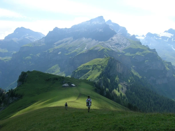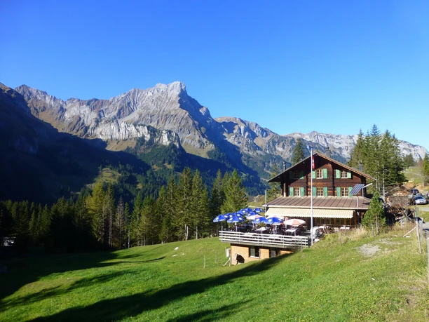 Depuis l'arrêt de bus Kiental en direction de la vallée et descendre vers la Chiene. Traverser celle-ci à la station inférieure du télésiège et monter doucement sur le chemin de vallée le long du Gornerewasser jusqu'à Losplatte. L'hôtel et l'arrêt de bus Bir Alperue se trouvent plus loin dans la vallée, à quelques pas au-delà du ruisseau que l'on suit jusqu'au lac Tschingelsee. Ce lac s’est formé en 1972 après un violent orage qui a bloqué le fond de la vallée sur 6 m de haut avec des débris et de la boue. Au fond du Gorneregrund, le sentier des eaux vives offre des aperçus saisissants des eaux sauvages des gorges de Griess. Le soi-disant chaudron des sorcières porte bien son nom ! Sur un chemin bien aménagé, on monte jusqu’à Golderli. Le petit chemin alpin en direction de l'Aabeberg continue de monter fortement. Seule une courte traversée entre Gälmli et Chollere permet une petite pause. Mais la montée vers la Chanzel est encore corsée. Entre des rochers calcaires clairs puis sur une large crête herbeuse, on atteint le point le plus élevé de l'Aabeberg. La vue panoramique est incomparable ! Particulièrement l’extrémité sud de la vallée avec les cascades de Dündefälle dévalant la pente, ainsi que les Blüemlisalp et Gspaltenhorn sont uniques. La descente revient à la Chanzel puis, aussi raide que la montée, descend en zigzag vers Spiggegrund/Schwand. Au fond de la vallée, le Spiggebach est franchi. Alternant entre pâturages et forêt, on arrive à Spiggeweid, puis, sur un sentier étroit, on traverse en hauteur le ravin sauvage sous une falaise pour rejoindre Kiental.