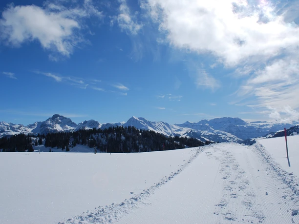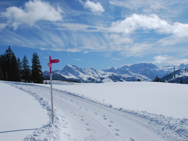 Si un compositeur devait mettre cette randonnée en musique, il utiliserait probablement une « musique de film » assez dramatique : enroulement de la scène avec des roulements de tambour et des fanfares, sur fond du drame paysager imminent – un drame toutefois très joyeux et réjouissant. La boucle préparée par un engin de damage commence au terminus du bus près de l’hôtel Sparenmoos. En légère montée, elle longe la pente en direction sud-ouest. À chaque pas s’étend un panorama merveilleux. À chaque pas, la vue s’élargit sur la commune étendue de Saanen et sur les sommets enneigés qui entourent la vaste plaine. À la majestueuse cabane alpine Vordere Hüsliberg, le chemin tourne au nord. Il faut alors décider : pour parcourir la boucle classique, prendre le chemin à gauche à la bifurcation ; pour une variante plus courte, emprunter le chemin de droite (qui ramène en environ 40 minutes directement au Sparemoos).