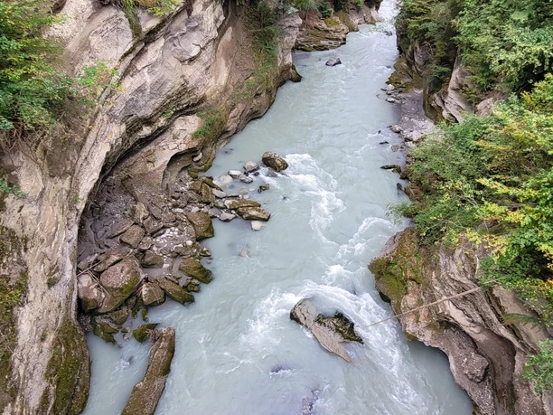 La randonnée longe la rive du lac de Thoune à travers le parc Bonstetten. Par le village de Gwatt, on monte raide jusqu'à atteindre le Burgunderweg. Ici, une vue magnifique s'offre sur l'Eiger, le Mönch et la Jungfrau, sur le lac de Thoune et jusqu'à Thoune. Le sentier étroit est bordé à gauche et à droite de saules et de puissants vieux marronniers. Sur la crête apparaît bientôt la imposante tour à poudre, la "Strättligburg". Un peu en contrebas, on atteint vite la route et on la traverse. Ensuite, il descend brièvement et raide par des marches d'escalier. La Kander trace son chemin profondément en contrebas à travers la gorge. Sur le pont Strättligsteg, on regarde profondément en bas.