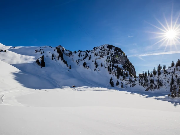 Depuis la station intermédiaire Chrindi, le parcours suit le chemin hivernal vers la région Hinterstockenalp où le véritable parcours circulaire commence. D’abord en suivant le chemin d’été jusqu’au point 1764, le sentier tourne ensuite à droite et monte d’abord abruptement, passant sous le Cheibehorn par un petit vallon enneigé jusqu’à la hauteur du panneau indicateur avec la bifurcation vers Cheibehorn et Oberstockensee. Ce splendide point de vue est accessible par une trace sur la crête étroite. Du sommet, la vue s’étend vers le sud sur les Alpes bernoises et vers le nord-ouest sur la chaîne du Gantrisch.