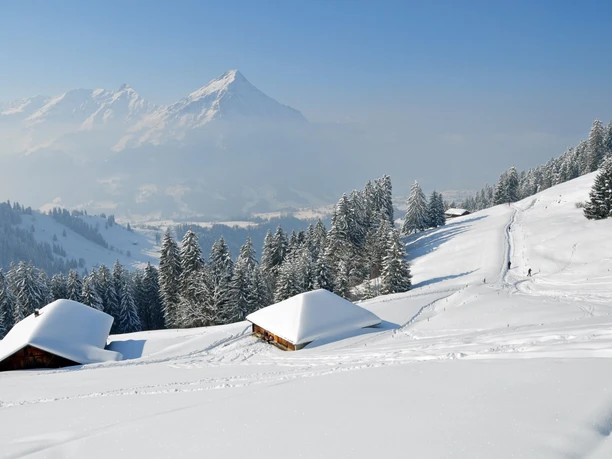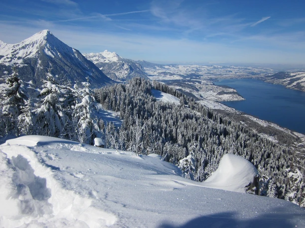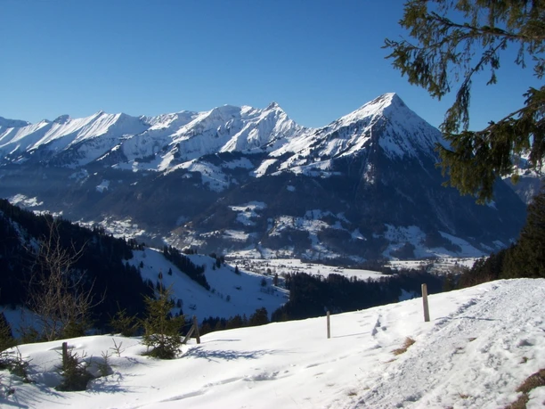 Dans un grand arc et en montant doucement, l'itinéraire raquettes balisé quitte le quartier d’Aeschiried. Il monte à travers des alpages enneigés jusqu’à Aeschiallmi. Autour du téléski et de la célèbre cabane de ski, on rencontre d’autres amateurs de sports d’hiver. Dès ici, une superbe vue s’ouvre sur la vallée de la Kander. Pour gagner confortablement de la hauteur dans un terrain un peu plus raide, on suit le chemin d’été enneigé jusqu’à l’alpage Bireberg. À la cabane de l’alpage, on quitte le chemin et monte à travers un terrain dégagé jusqu’à la crête. L’itinéraire suit maintenant la crête en montant régulièrement via Greberegg jusqu’au pied du Morgenberghorn. Greberegg invite à faire une pause et offre une vue fantastique tant sur le lac de Thoune et le lac de Brienz que sur la vallée de la Kander plus en amont. Ensuite, une dernière montée raide conduit à l’alpage Brunni avec la spacieuse cabane Brunnihütte (non gardée). Lors d’une pause prolongée au pied du Morgenberghorn, on profite du magnifique panorama. Le chemin de retour vers Aeschiried s’effectue par le même sentier.