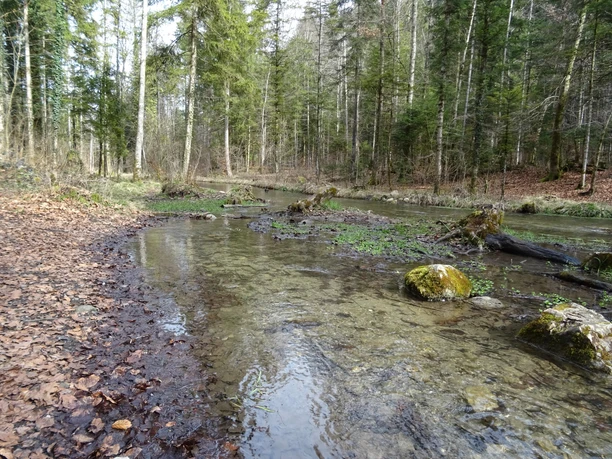Depuis l'arrĂªt de bus, le sentier suit le GlĂ¼tschbach qui coule paisiblement dans la vallĂ©e sauvage et romantique, jusqu'aux impressionnantes grottes de stalactites. Devant les grottes, un emplacement couvert pour faire un barbecue invite Ă la dĂ©tente, et le GlĂ¼tschbach peu profond attire les enfants pour jouer. Avant que la Kander n'ait Ă©tĂ© dĂ©tournĂ©e vers le lac de Thoune il y a plus de 300 ans, elle coulait Ă travers cette vallĂ©e et se jetait Ă l'ouest de Thoune dans l'Aar. Cela causait rĂ©gulièrement des inondations. Après le dĂ©tournement, l'ancien lit de la Kander s'est assĂ©chĂ© et la nappe phrĂ©atique a fortement baissĂ©. Les communes environnantes ne pouvaient plus faire fonctionner leurs moulins ni irriguer les champs. C'est ainsi que le GlĂ¼tschbach a Ă©tĂ© canalisĂ© et dirigĂ© vers l'ancien lit de la Kander, ce qui a amĂ©liorĂ© la situation de l'eau.