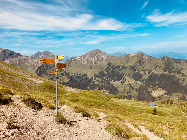 En partant du petit village de montagne Saxeten, le sentier suit le rugissant Saxetbach en direction de Unterberg. Environ 300 mètres après la centrale, on suit le sentier de montagne partant à gauche montant doucement vers l’alpage Schlipfwengen. Ici, le sentier de randonnée tourne d'abord à droite à travers un pâturage escarpé puis plus tard à travers des bandes rocheuses jusqu’à la cabane alphütte Usserbällen. Un café à la grande table devant la cabane est bien mérité. Des prairies fleuries bordent la montée vers la Bällefurgge (point 1998). Une excursion à la proche plateforme panoramique Bällehöhchst est recommandée.