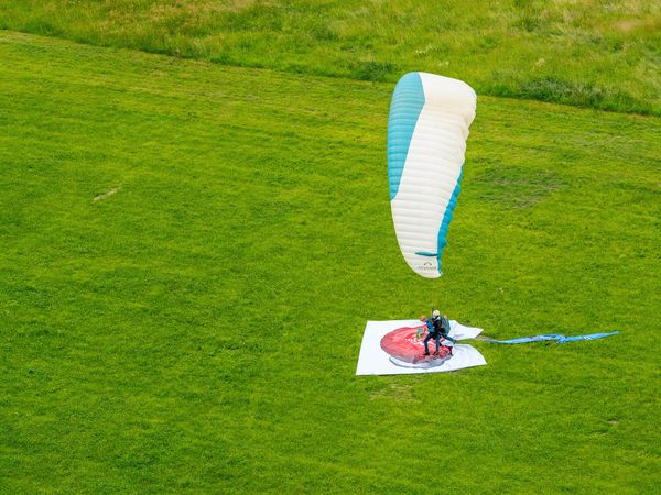 Punktgenau landet der Gleitschirm mit der Fahne von Interlaken Tourismus auf dem «Neustart-Knopf». Mit ihrer Landung lancieren der Interlakner Tourismusdirektor Daniel Sulzer und der Pilot und Vorstandsmitglied des Vereins Interlaken Hostels & Adventure (IHA) Pitsch Bühler den Tourismus neu. Wenig später flatterte auch die Schweizerfahne an einem zweiten Tandem-Gleitschirm über die Dächer ins Zentrum Interlakens auf die Höhematte. Elegant setzt er beim «Neustart-Knopf» auf und legt seinen Schirm, wie einen Kranz um ihn herum.